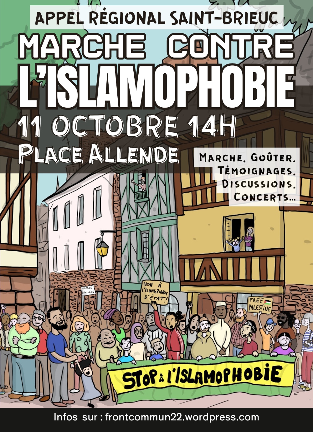 Parce que l’islamophobie tue. Parce que le racisme (dont l’islamophobie est la pointe avancée) divise notre classe. Parce que l’islamophobie renforce le RN et son projet fasciste. La gauche qui est restée trop longtemps passive face aux lois et discours islamophomes doit réagir. Nous devons faire front commun contre ’islamophobie. RDV le 11 octobre à 14h place Allende à St-Brieuc pour une marche suivi d’une assemblée, d’animations et de concerts.