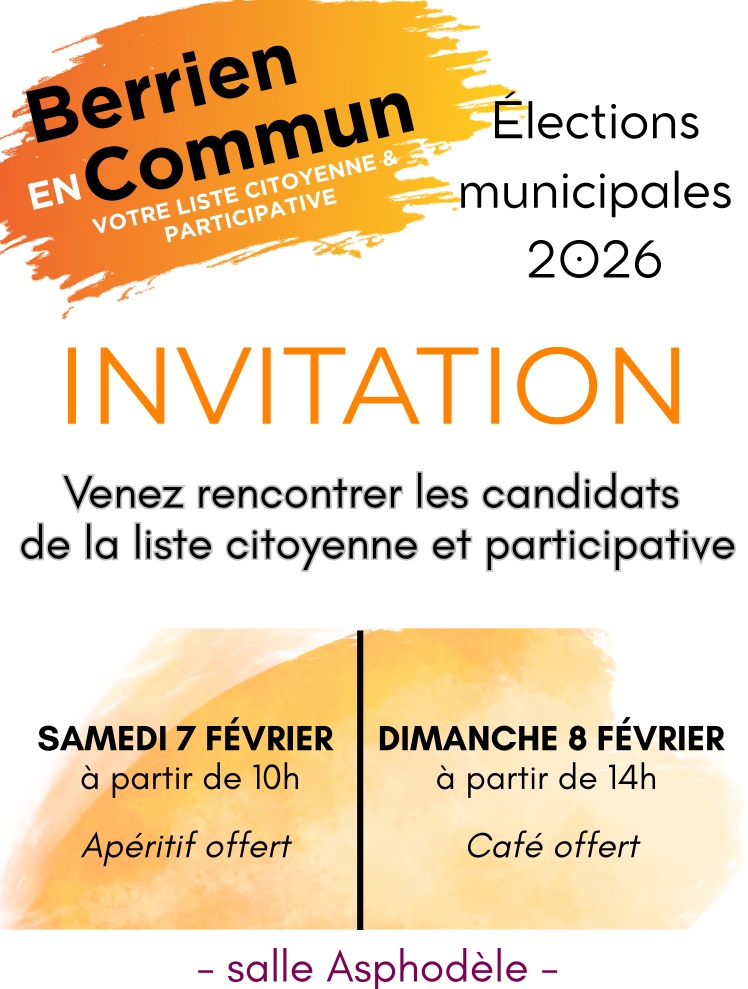 Nous vous invitons à rencontrer l’équipe de la liste Berrien en Commun les 7 et 8 février à la salle Asphodèle.