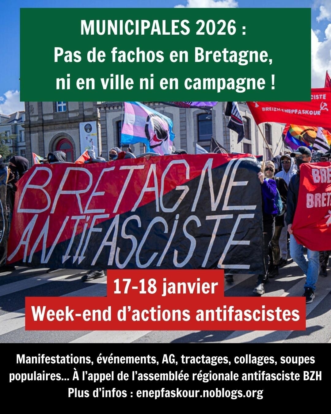 Parce que la Bretagne est et doit rester ouverte et solidaire, nous vous invitons à organiser des tractages, soupes populaires, collages, AG antifascistes, etc, pour permettre au plus grand nombre de s’organiser contre la menace fasciste qui devient de plus en plus pressante (même en Bretagne).